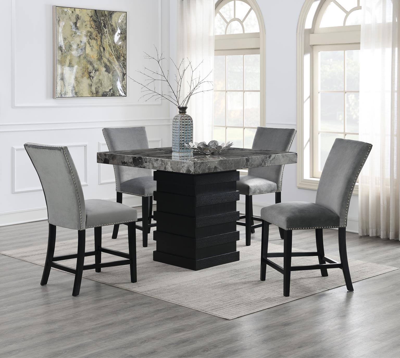 COUNTER TABLE & 4 SILVER LEATHER CHAIRS